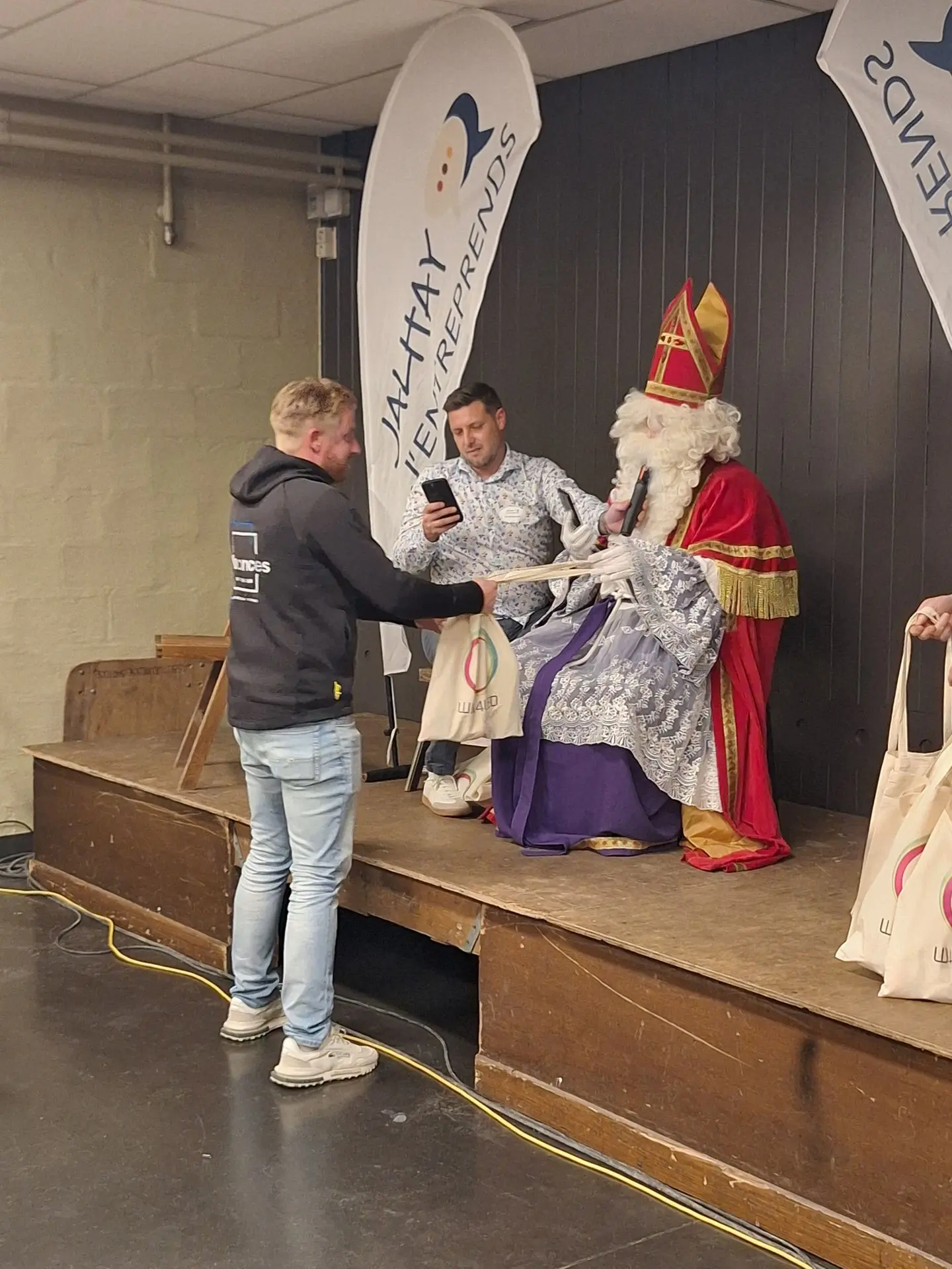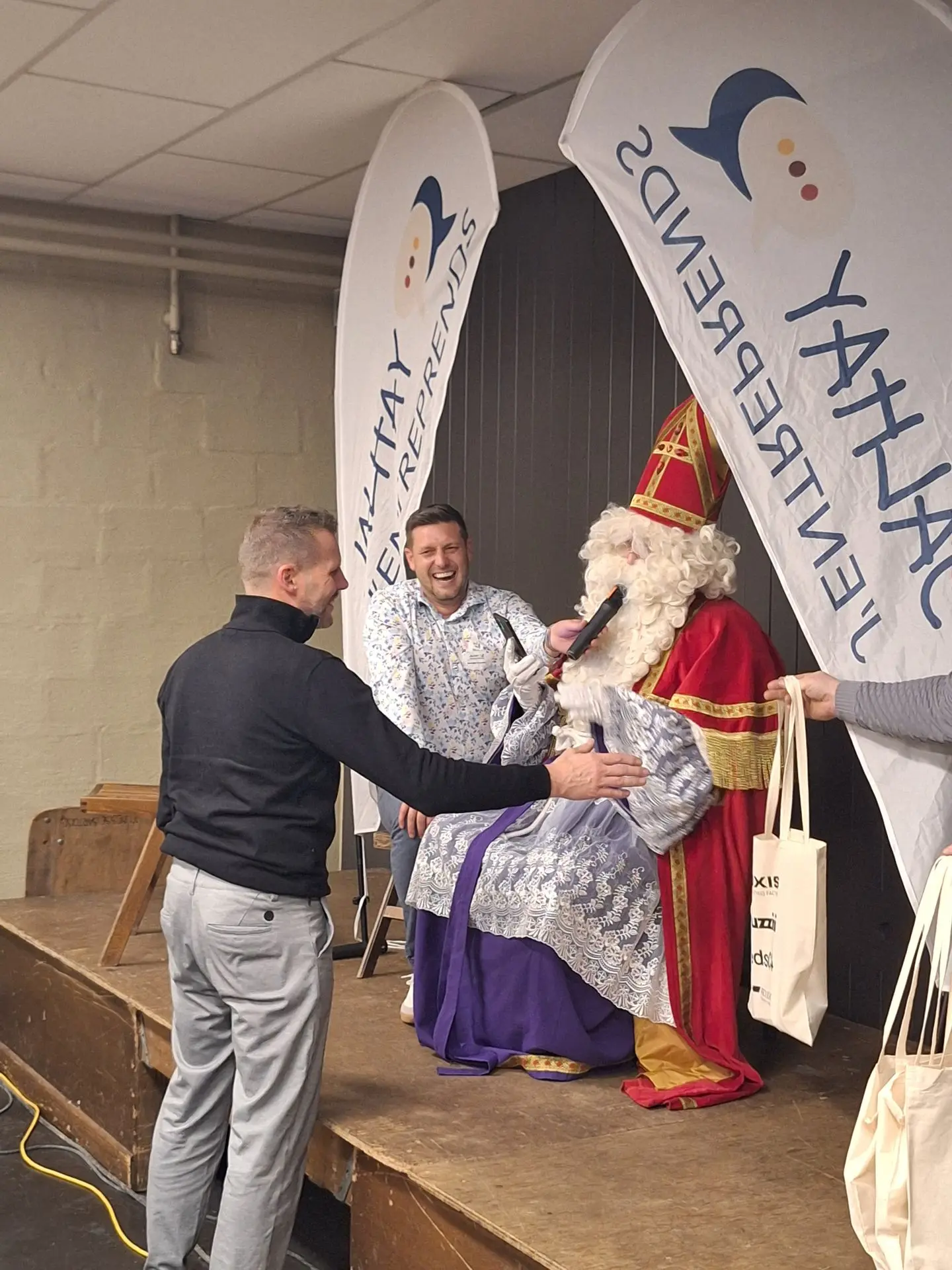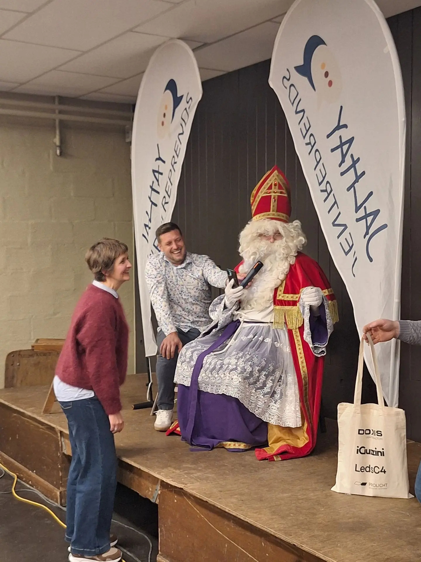 Cette fois, pas de discours, juste un petit mot de notre président Alexandre Dauvister pour accueillir l'invité surprise de la soirée, une grande première pour JJE, Saint-Nicolas "himself" !!! Pour le plus grand plaisir des petits et des plus grands, le Grand Saint a distribué des sachets de goodies à tous les participants, heureusement qu'ils ont été bien sages et travailleurs durant l'année ;-)